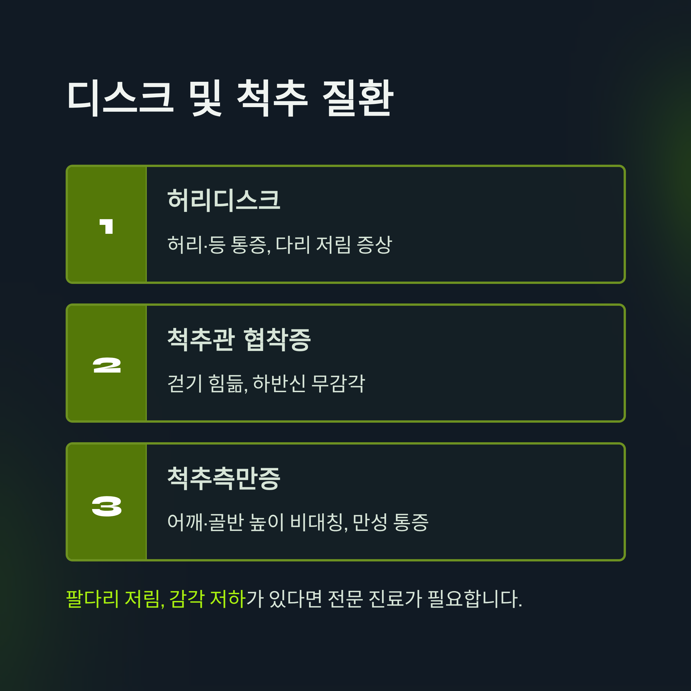 | 허리디스크 | 허리·등 통증, 다리 저림 |