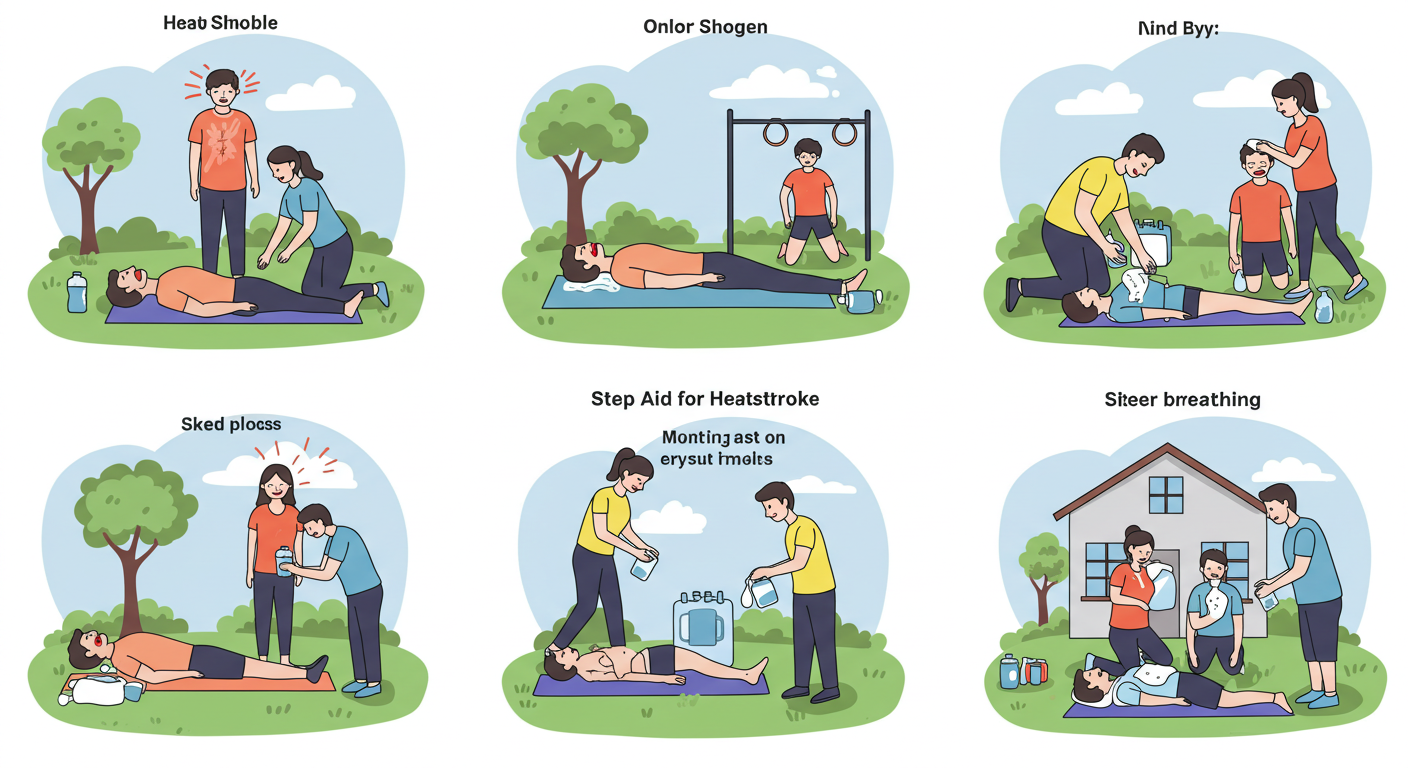 응급처치 3단계: 시원한 곳 이동 → 체온 낮추기 (젖은 수건, 냉찜질) → 필요시 119 신고!